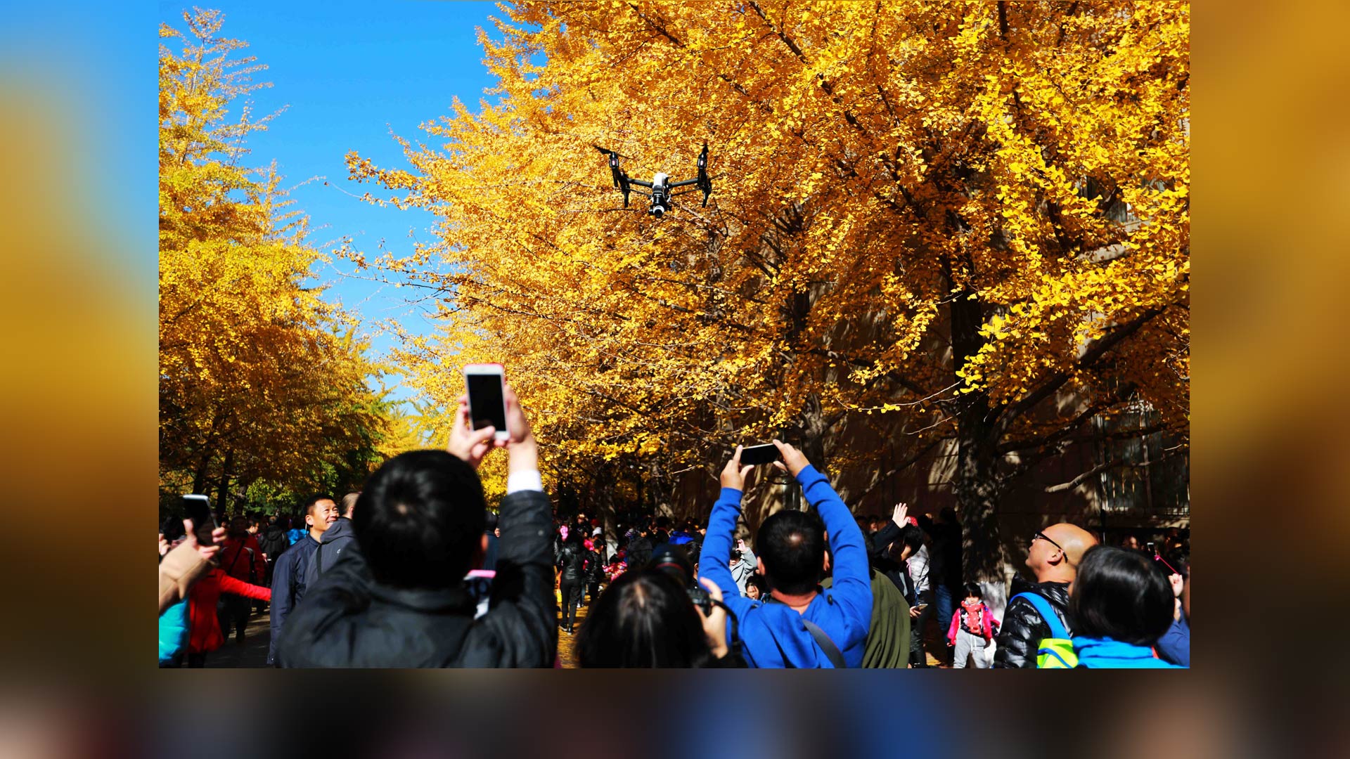 황금빛으로 물드는 가을, 랴오닝(遼寧) 선양(沈陽)시 랴오닝대학 쑹산 캠퍼스 은행로의 은행나무가 절정을 맞으면서 많은 인파가 몰려들었다.