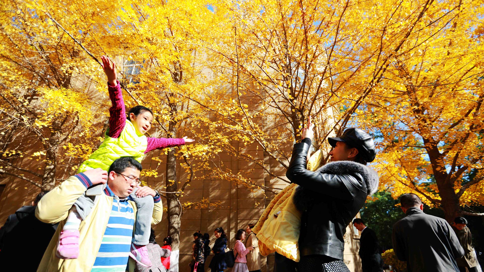 황금빛으로 물드는 가을, 랴오닝(遼寧) 선양(沈陽)시 랴오닝대학 쑹산 캠퍼스 은행로의 은행나무가 절정을 맞으면서 많은 인파가 몰려들었다.