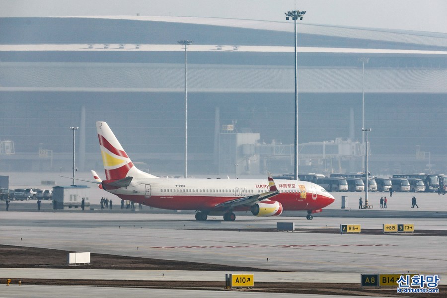 22일 샹펑(祥鹏·Lucky Air)항공사의 B737-800 여객기가 중국 쓰촨(四川)성 청두(成都) 톈푸(天府)국제공항에 정차하고 있다. 2021.1.22
