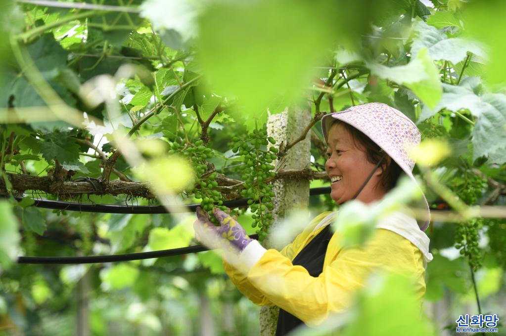 광시좡족자치구 둥란현 무좐진 둥리촌 포도밭에서 농부가 포도를 살펴보고 있다.(5월6일 촬영)