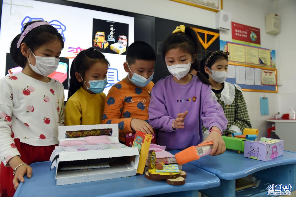 [신화망 허페이 5월13일] 학생들이 11일 안후이(安徽)성 허페이(合肥)시의 한 초등학교에서 자신이 손수 제작한 수공예품을 보여주고 있다. 안후이성은 지난 9일부터 오는 15일까지를 두 번째 '학생 노동교육 홍보주간'으로 정했다. 이에 각 학교는 요리·재배·도예 등 다채로운 동아리 수업 활동을 개최해 노동의 소중함과 즐거움을 전파했다. 2022.5.11