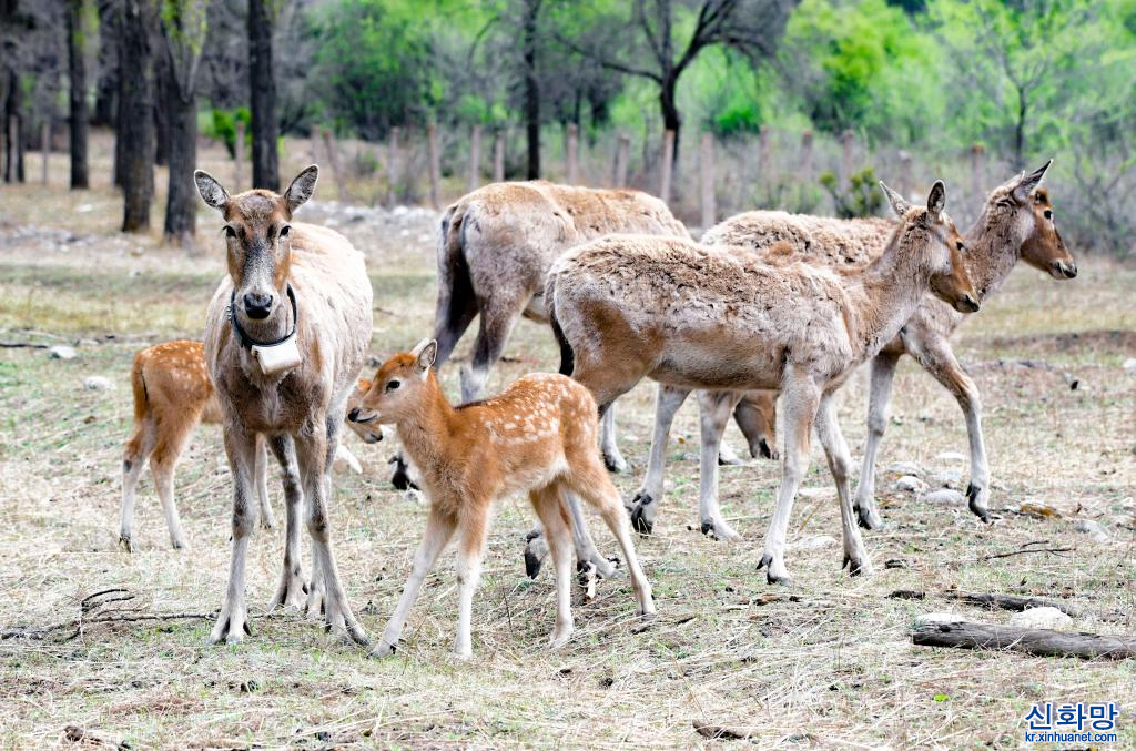 [신화망 후허하오터 5월15일] 작은 사불상이 13일 네이멍구(內蒙古)자치구 다칭산(大青山)국가자연보호구에서 무리를 따라 움직이고 있다. 지난해 9월 29일 사불상 27마리가 다칭산국가자연보호구에서 생활을 시작했다. 이후 사불상 무리는 새로운 환경에 잘 적응해 지난달 3일부터 새끼 9마리가 차례로 태어났다. 2022.5.13