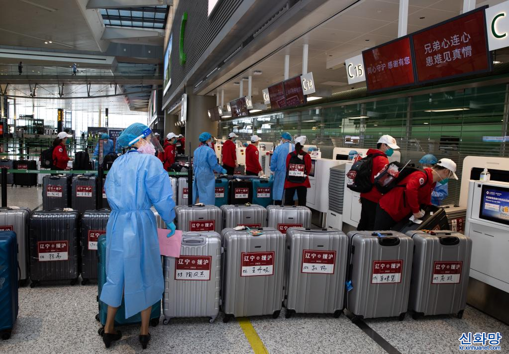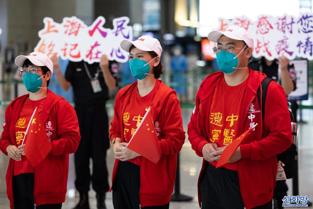 21일 상하이 훙차오 국제공항에서 랴오닝 의료팀 팀원들이 배웅 나온 사람들에게 작별 인사를 하고 있다.