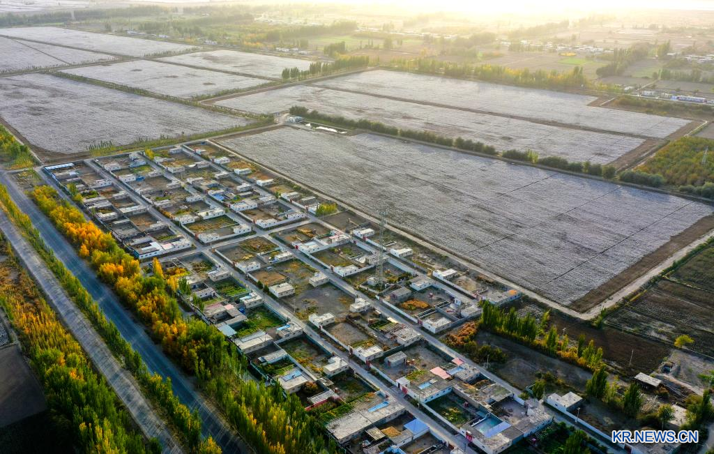 지난 18일 신장(新疆)위구르자치구 사야(沙雅)현 훙치(紅旗)진의 한 면화밭을 드론으로 내려다봤다. 10월이 되면 신장(新疆)은 면화 채취로 가장 분주한 시기를 맞는다. 신장(新疆) 농업농촌청 데이터에 따르면 올해 신장(新疆)생산건설병단을 제외한 신장(新疆) 면화 채취 기계화율이 80%가 넘을 것으로 예상된다. 2022.10.20