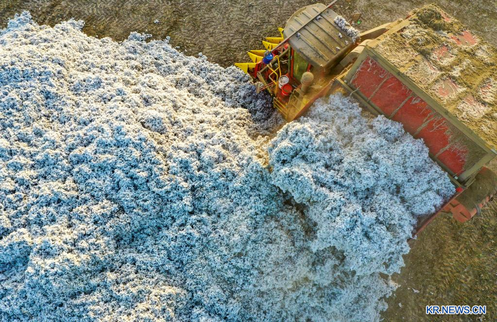 [신화망 우루무치 10월22일] 10월이 되면 신장(新疆)위구르자치구에선 면화 채취로 가장 바쁜 모습이 연출된다. 신장(新疆) 농업농촌청 데이터에 따르면 올해 신장(新疆)생산건설병단을 제외한 신장(新疆)지역 면화 채취 기계화율이 80%가 넘을 것으로 예상된다. 지난 17일 신장(新疆) 사야(沙雅)현 훙치(紅旗)진의 한 면화밭에서 면화채취기가 면화를 내리고 있다. 2022.10.20