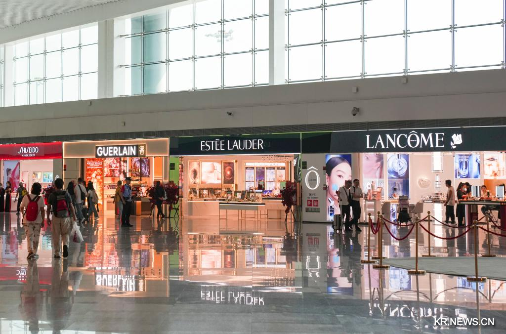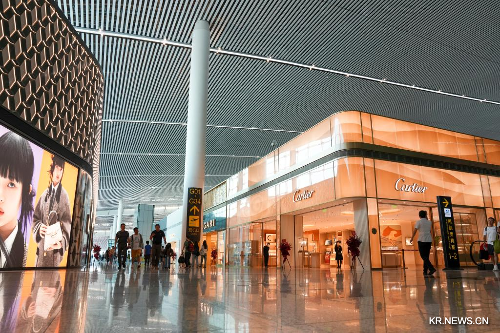 [신화망 충칭 9월4일] 탑승객들이 3일 충칭(重慶) 장베이(江北)국제공항 T3A 터미널 해외 명품 매장을 둘러보고 있다.