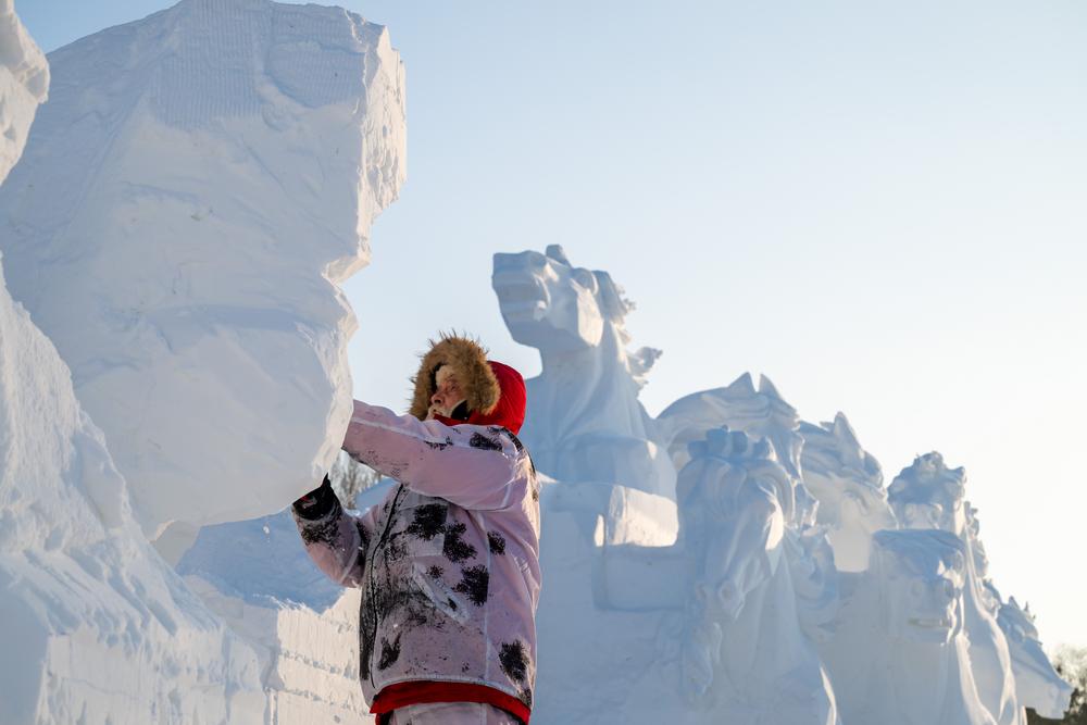 한 참가자가 6일 하얼빈 타이양다오 국제눈조각예술박람회 단지에서 눈 조각품을 만들고 있다. 2025.1.6
