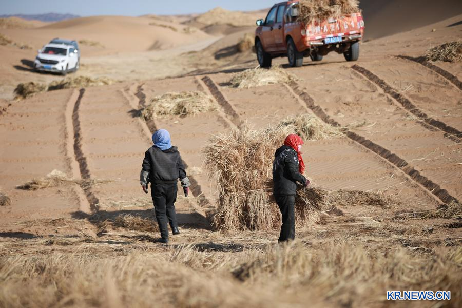 네이멍구 쿠부치(庫布其)사막 깊숙한 곳. 즐비한 파란 태양광 패널이 겨울 햇살 아래 반짝이고 있다. 패널을 통해 흡수된 햇빛은 전기로 변환돼 수천 가구에 공급된다. 패널 아래에는 다양한 종류의 관목이 우뚝 솟아 있다. 관목들은 휴면에 들어가 잎이 노랗게 변한 상태에서도 땅을 보호하기 위해 모래바람을 막아내고 있다.