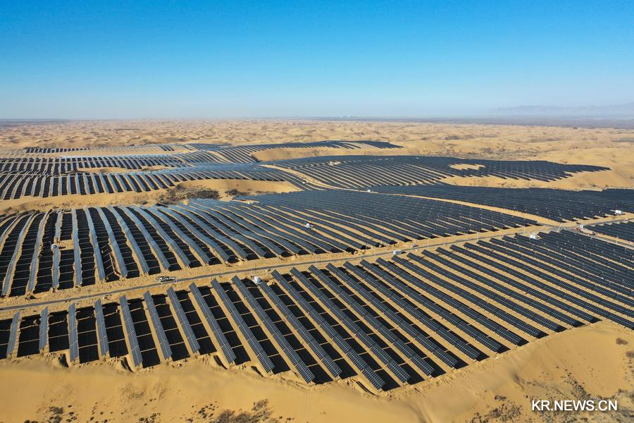 네이멍구 어얼둬쓰(鄂爾多斯)시 준거얼(準格爾)기의 한 사막 태양광발전 기지에서는 인프라 공사가 막바지 단계에 접어들었다.