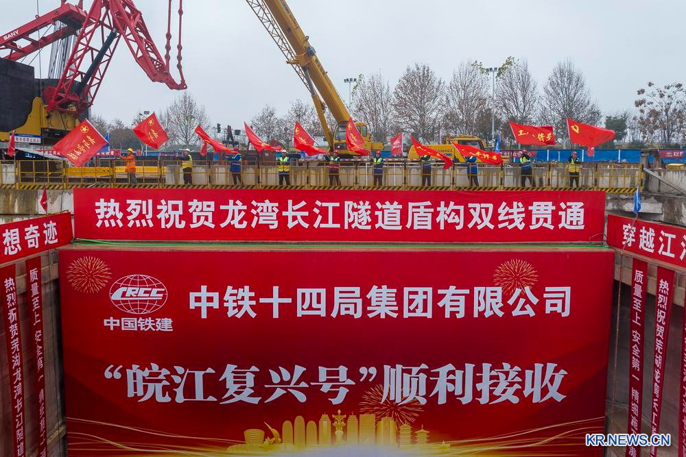 26일 중철(中鐵)14국 직원들이 우후(蕪湖) 룽완(龍灣) 창장(長江) 터널의 전 구간 관통을 축하하는 모습을 드론 사진에 담았다.
