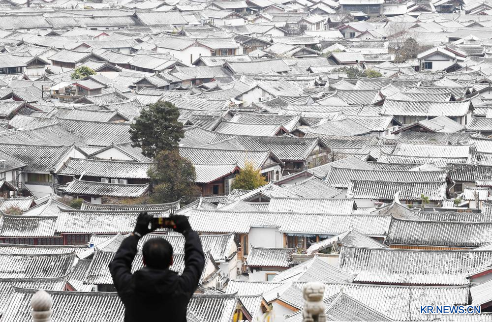 27일 윈난(雲南)성 리장(麗江) 고성에서 설경을 카메라에 담고 있는 관광객. 2025.1.27