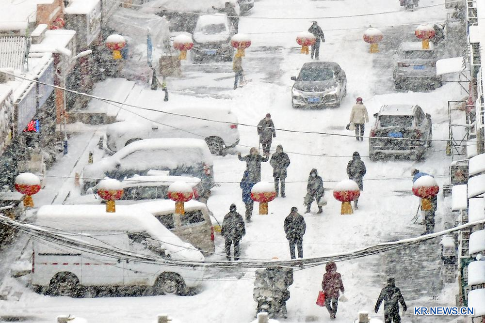 27일 산둥(山東)성 옌타이(煙台)시에서 행인들이 눈을 맞고 있다.