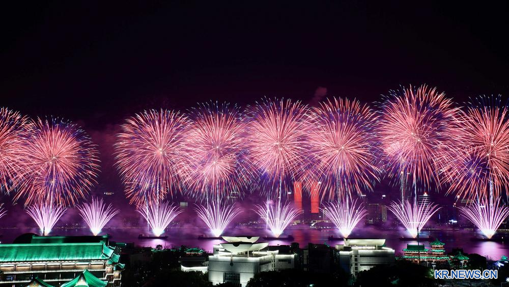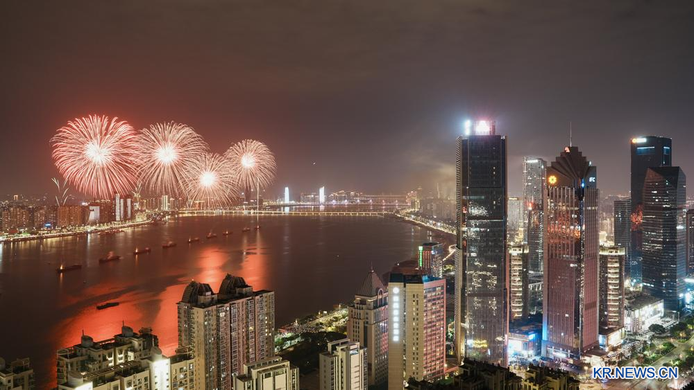 '2025년 난창(南昌) 봄맞이 불꽃놀이'가 29일 장시(江西)성 난창시 간장(贛江) 라오관저우(老官洲) 수역에서 펼쳐졌다.