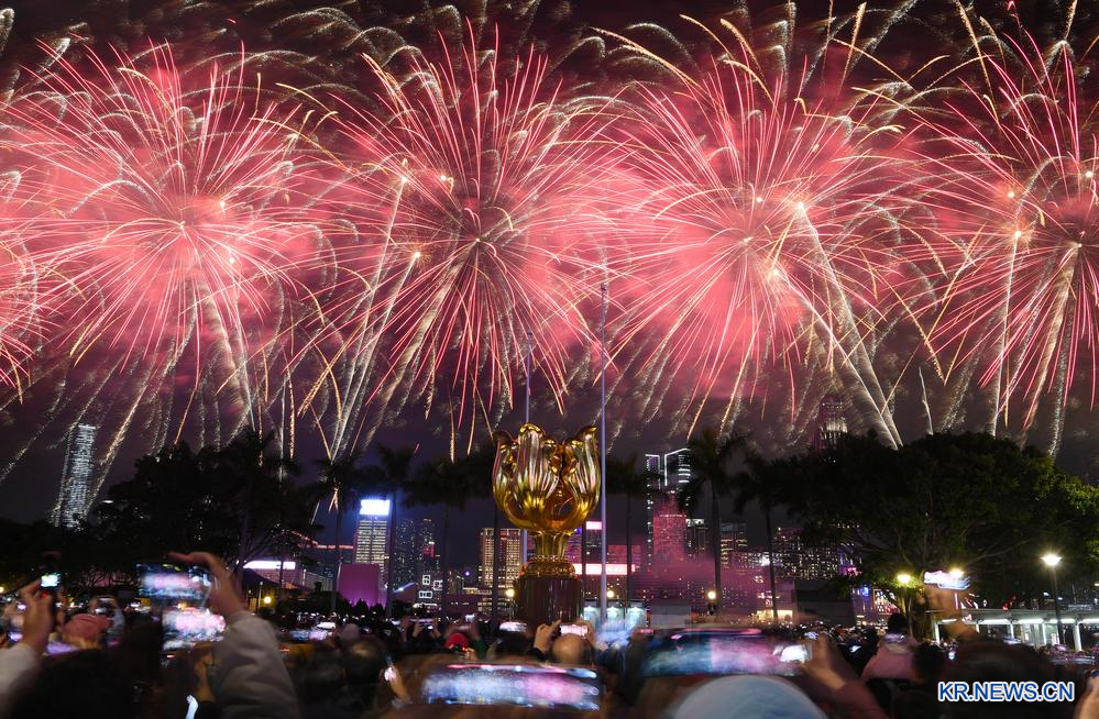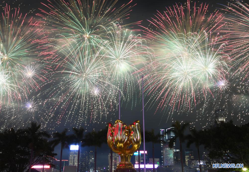 [신화망 홍콩 1월31일] 30일 홍콩 빅토리아항에서 새해맞이 불꽃놀이가 진행돼 밤하늘을 아름답게 수놓았다. 2025.1.30