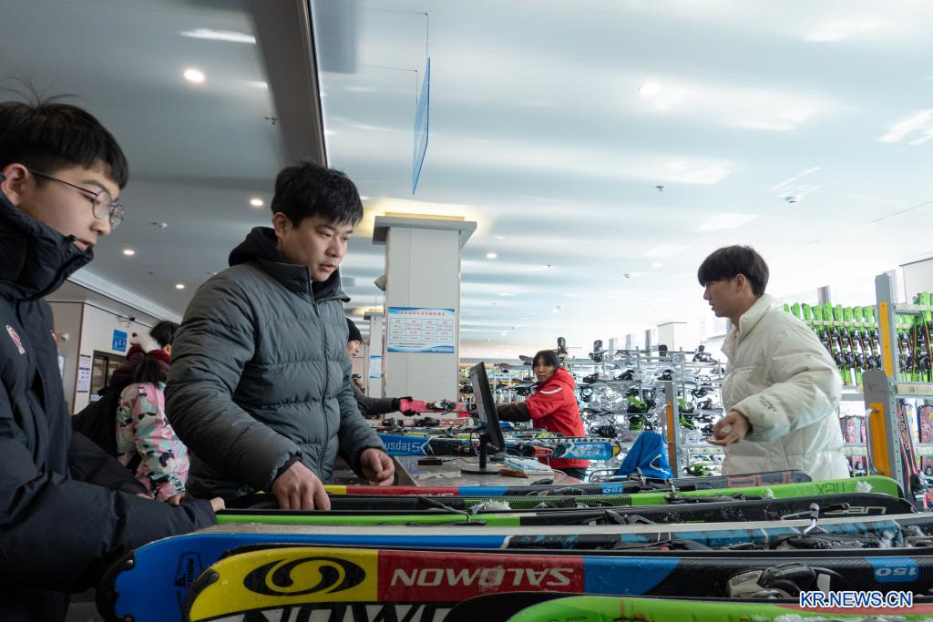 진자이 롄화산 스키장에서 스키 장비를 고르기 위해 줄을 선 관광객.