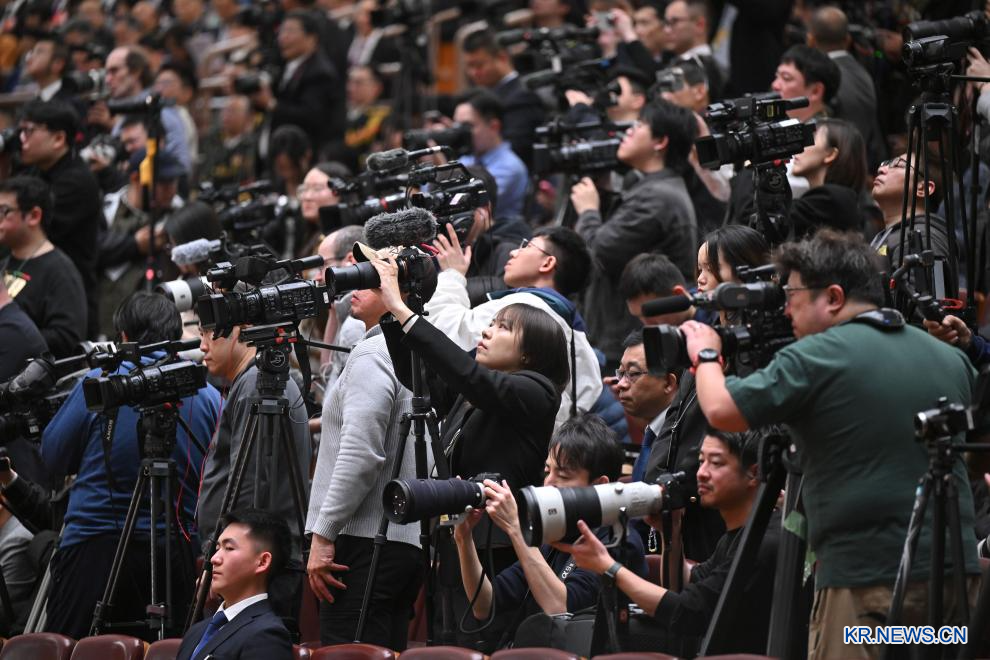 제14기 전국인민대표대회(전인대) 제3차 회의가 5일 베이징 인민대회당에서 개막했다.사진은 현장에서 취재하는 기자들.[촬영/신화사 기자 웨웨웨이(岳月偉)]