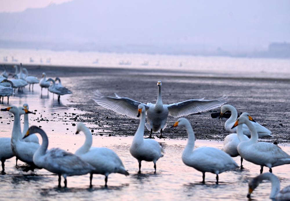 날씨가 따뜻해지면서 룽청에서 겨울을 난 큰고니 떼들이 차례로 북쪽으로 이동하고 있다. 룽청은 '중국 큰고니의 고장'으로 매년 1만 마리가 넘는 큰고니 떼가 이곳에서 월동하고 있다. 2025.3.6