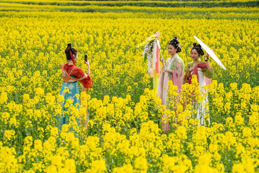 지난 4일 쓰촨(四川)성 광안(廣安)시의 한 유채꽃밭에서 관광객이 기념사진을 찍고 있다. 2025.3.6