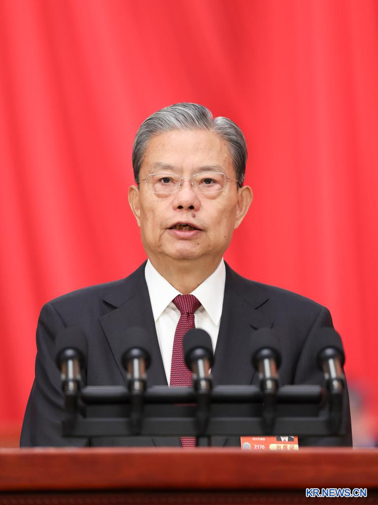 [신화망 베이징 3월8일] 제14기 전국인민대표대회(전인대) 3차 회의는 8일 베이징 인민대회당에서 제2차 전체회의를 열었다. 전인대 상무위원회 위탁으로 자오러지(趙樂際) 위원장이 대회에 전인대 상무위원회 업무를 보고했다. [촬영/신화사 기자 딩하이타오(丁海濤)]