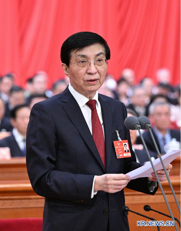중국인민정치협상회의(정협) 제14기 전국위원회 제3차 회의가 10일 베이징 인민대회당에서 폐막했다. 왕후닝(王滬寧) 전국 정협 주석이 회의를 주재하고 연설을 하고 있다. [촬영/신화사 기자 리쉐런(李學仁)]