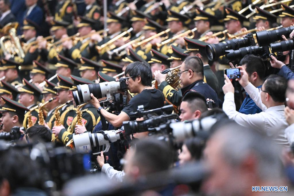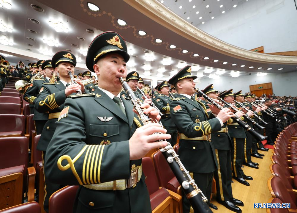 제14기 전국인민대표대회(전인대) 제3차 회의 폐막회가 11일 베이징 인민대회당에서 열렸다. 군악대가 연주를 하고 있다.[촬영/신화사 기자 뤼솨이(呂帥)]
