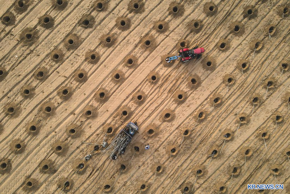 10일 허난(河南)성 상추(商丘)시의 한 삼림공원에서 작업자들이 나무를 식재하는 모습을 드론으로 촬영했다. 2025.3.10