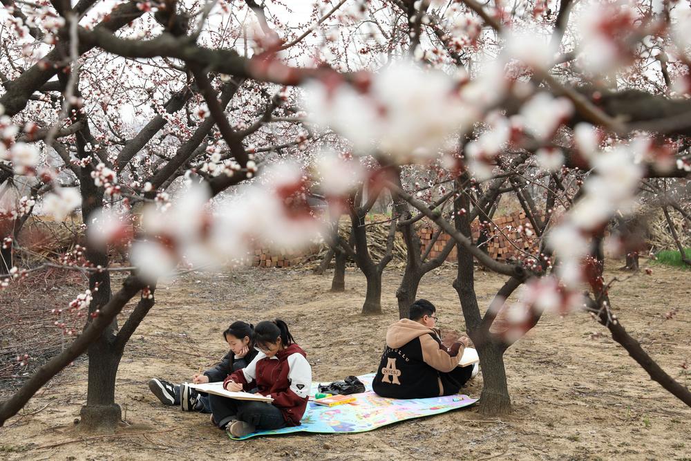 [신화망 베이징 3월14일] 13일 허난(河南)성 핑딩산(平頂山)시의 한 살구나무 농장에서 여유로운 한때를 보내고 있는 학생들. 2025.3.13