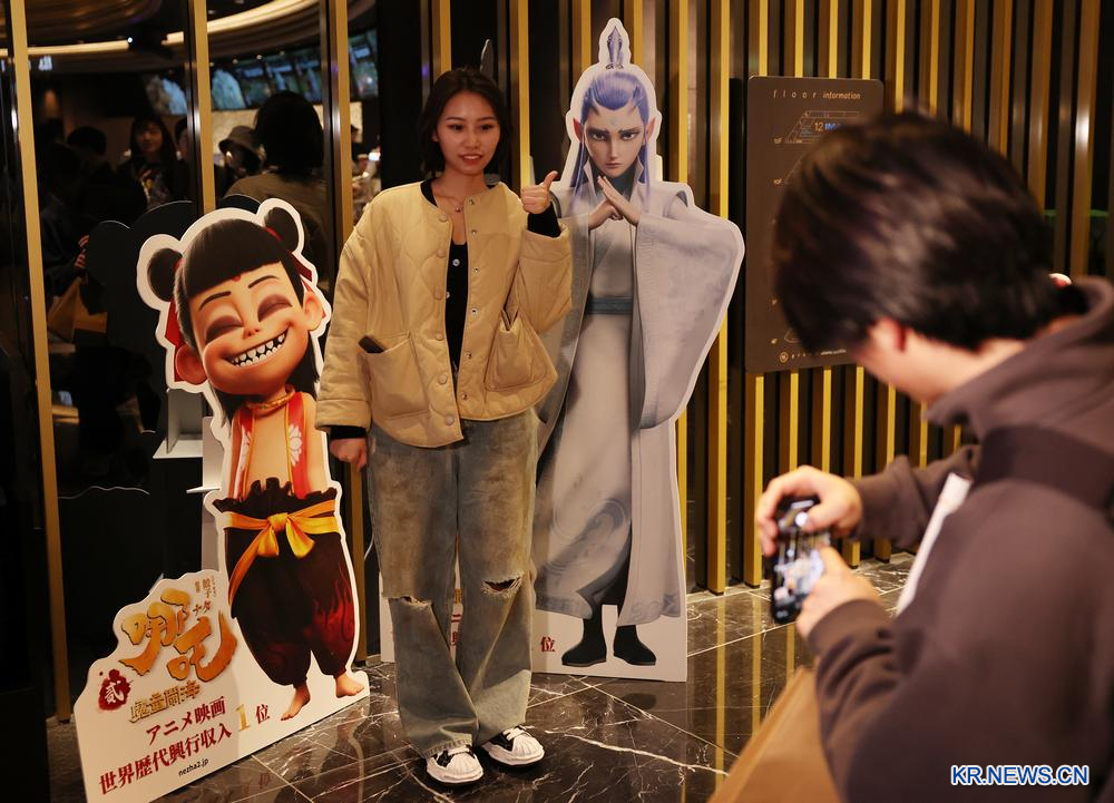 [신화망 도쿄 3월15일] 14일 일본 도쿄의 관객이 중국 블록버스터 애니메이션 '너자(哪吒)2'의 시사회가 끝난 후 영화 홍보 입간판 앞에서 기념사진을 찍고 있다.