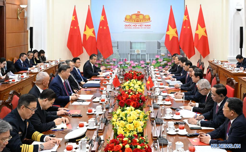 [신화망 하노이 4월15일]시진핑(習近平) 중국 공산당 중앙위원회 총서기, 국가주석이 14일 저녁 베트남 공산당 중앙당사에서 짠 탄 만 베트남 국회의장을 만났다. [촬영/신화사 기자 셰환츠(謝環馳)]pagebreak