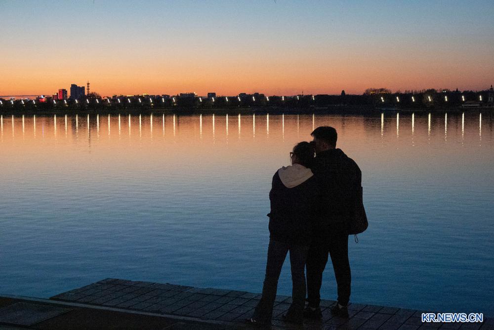 22일 쑹화장(松花江) 하얼빈(哈爾濱) 구간 강변에서 일몰을 감상하는 연인.
