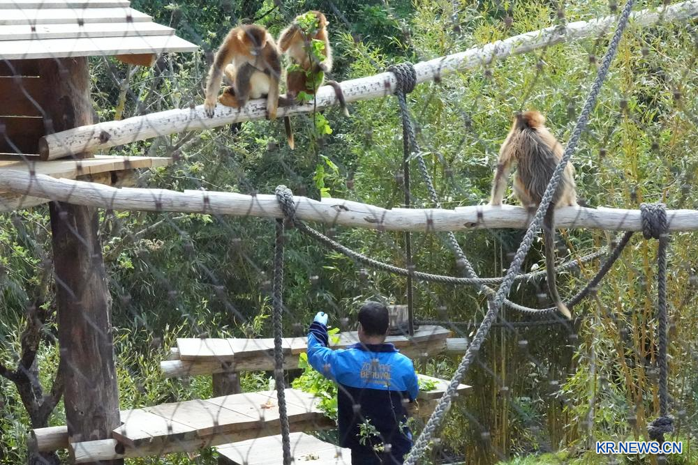 7일(현지시간) 프랑스 중부 소도시 생테냥에 위치한 보발 동물원에서 사육사가 황금들창코원숭이에게 사료를 주고 있다.