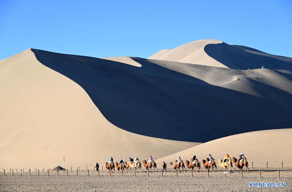 [신화망 둔황 5월12일] 10일 관광객들이 낙타를 타고 간쑤(甘肅)성 둔황(敦煌)시 밍사산(鳴沙山) 웨야취안(月牙泉) 관광지를 구경하고 있다.