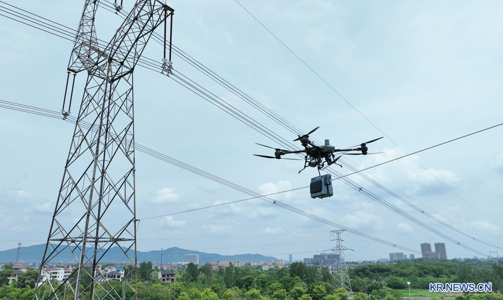 22일 저장(浙江)성 사오싱 주지(諸暨)시의 500㎸(킬로볼트) 선로에서 수리 로봇이 DJI(大疆·다장) 드론을 통해 전선을 수리하고 있다. 2025.5.22