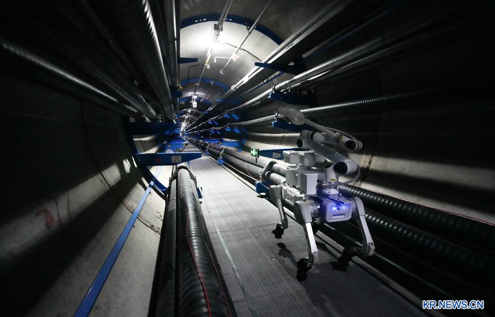 스마트 순찰 로봇이 22일 저장(浙江)성 사오싱(紹興)시 웨청(越城)구의 한 220㎸(킬로볼트) 케이블 터널에서 방전 상황을 점검하고 있다.