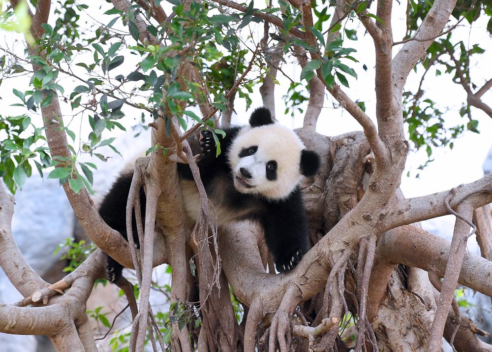 이날 수컷 아기 자이언트판다 '더더'가 홍콩해양공원 판다생활관에서 재롱을 피우고 있다. 2025.5.27