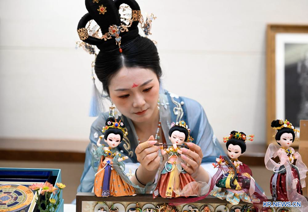 30일 고대 의복을 입은 여성이 '제4회 문명·교류 상호학습 대화회' 개막식 후 둔황(敦煌) 문화 테마 전시품을 정리하고 있다.