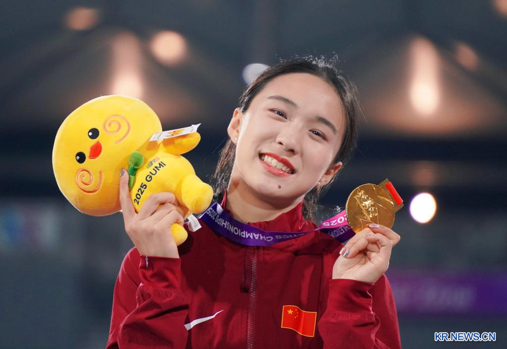 5월 31일 모자뎨(莫家蝶)가 여자 400m 허들 결승전이 끝난 후 열린 시상식에서 금메달을 깨물고 있다.2025.5.31