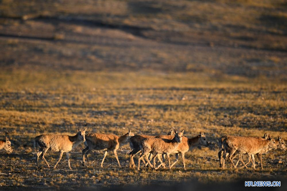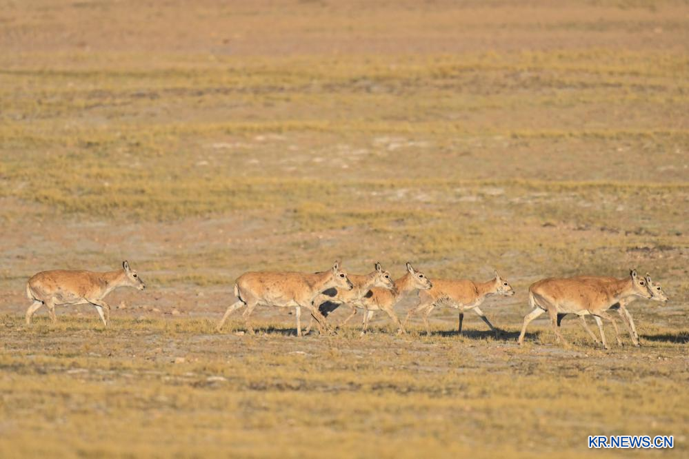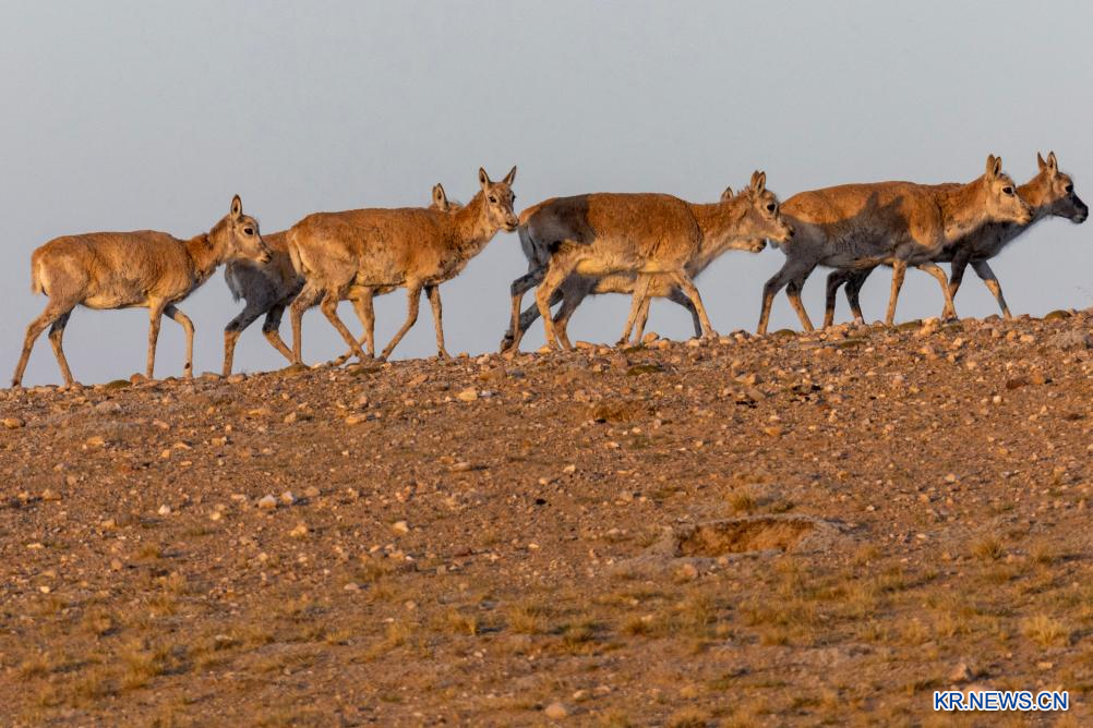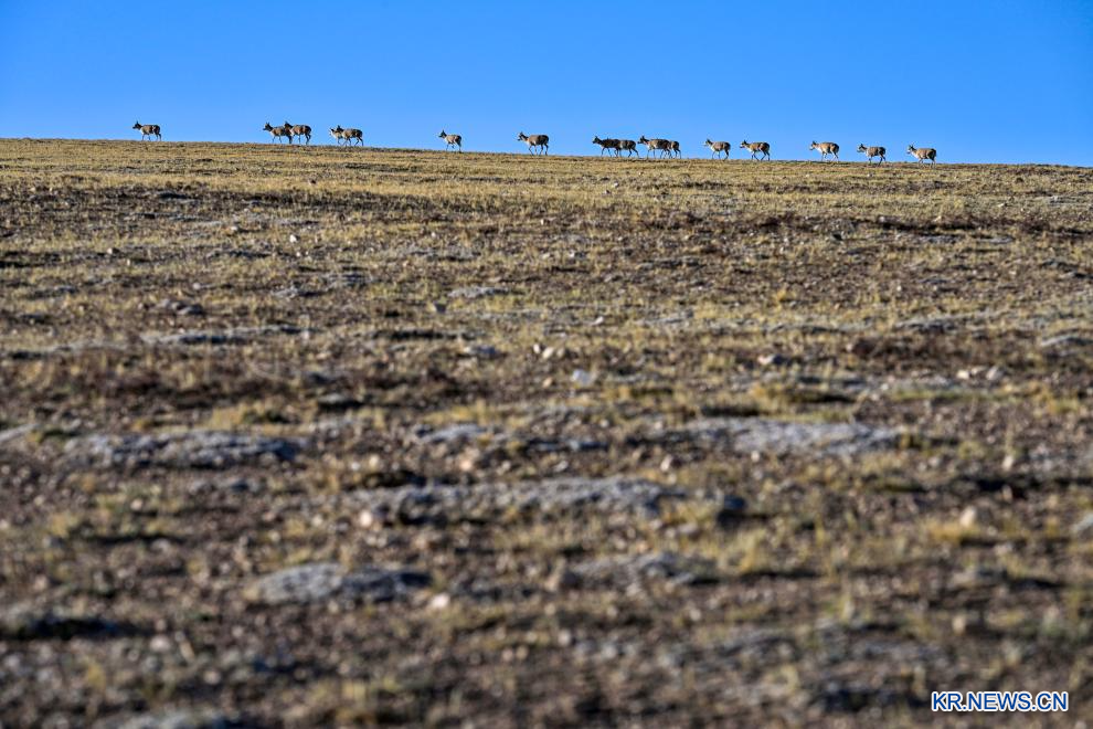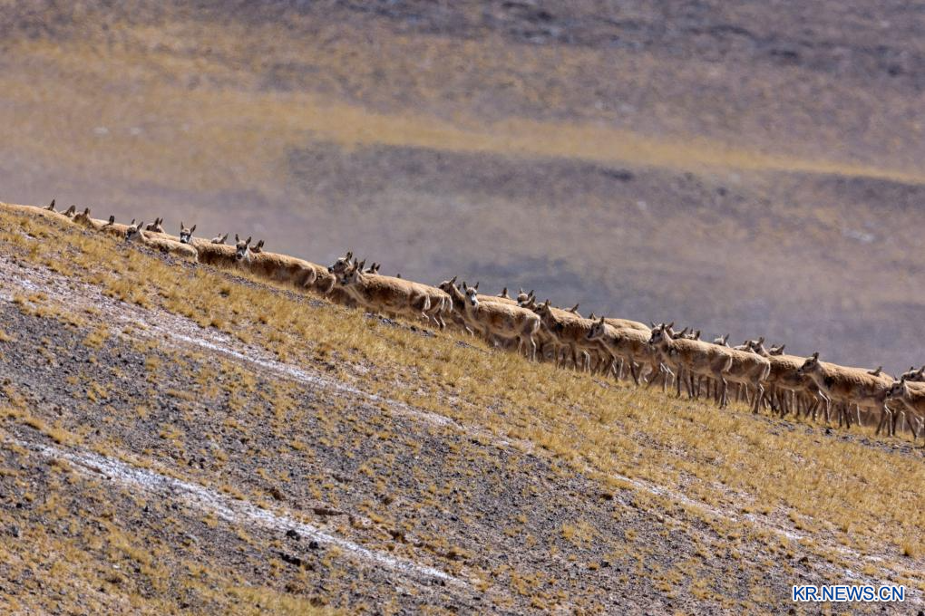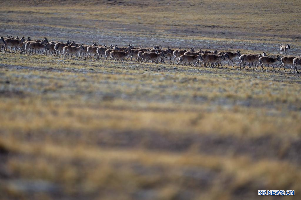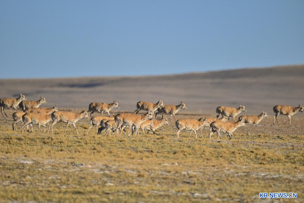 (중국 라싸=신화통신) 10일 짱링양(藏羚羊·시짱 영양) 암컷들이 시짱(西藏)자치구 창탕(羌塘) 국가급자연보호구에서 번식을 위해 이동하고 있다.
