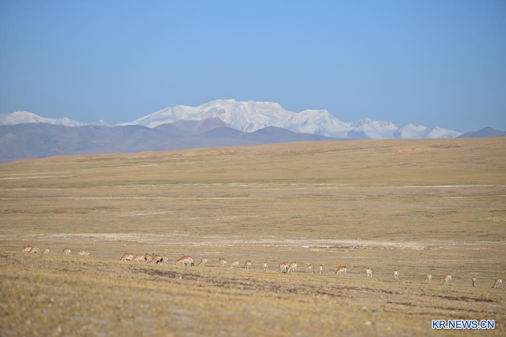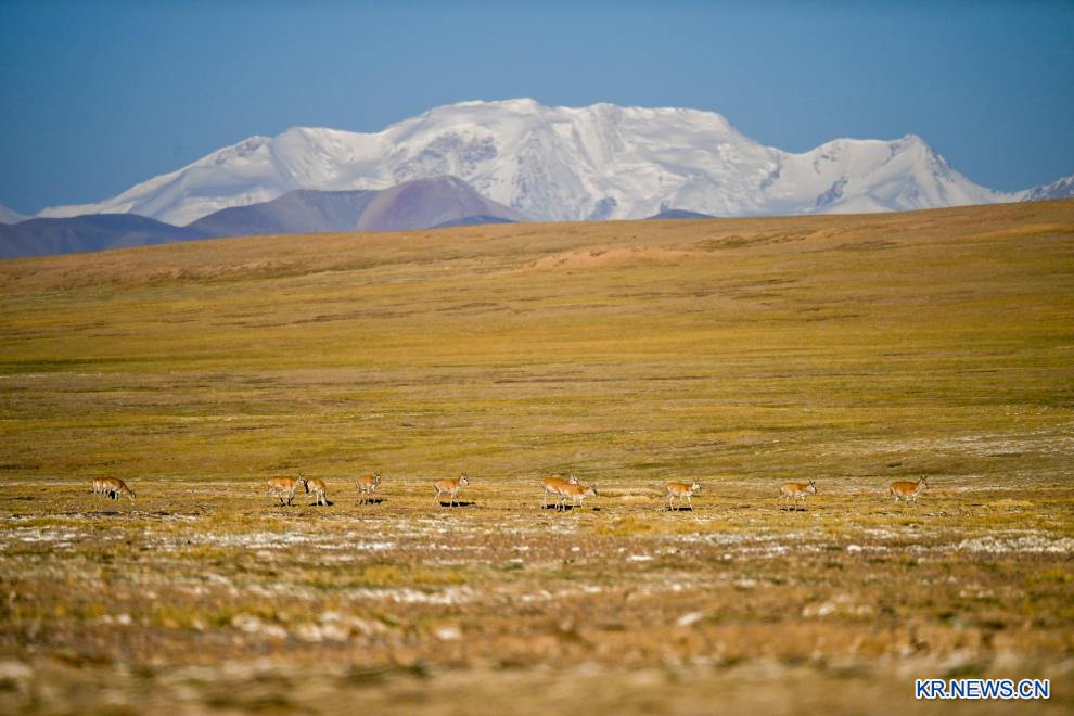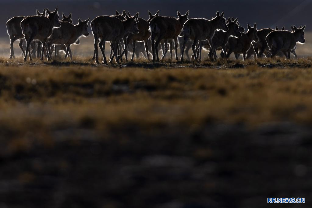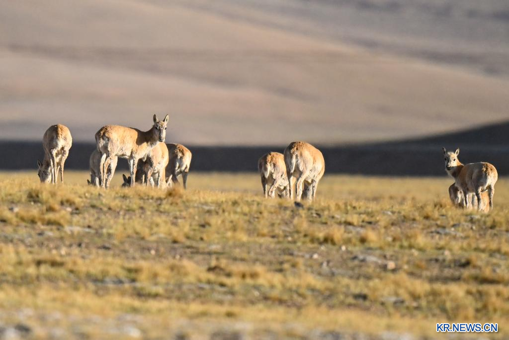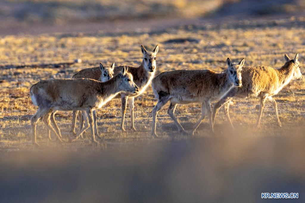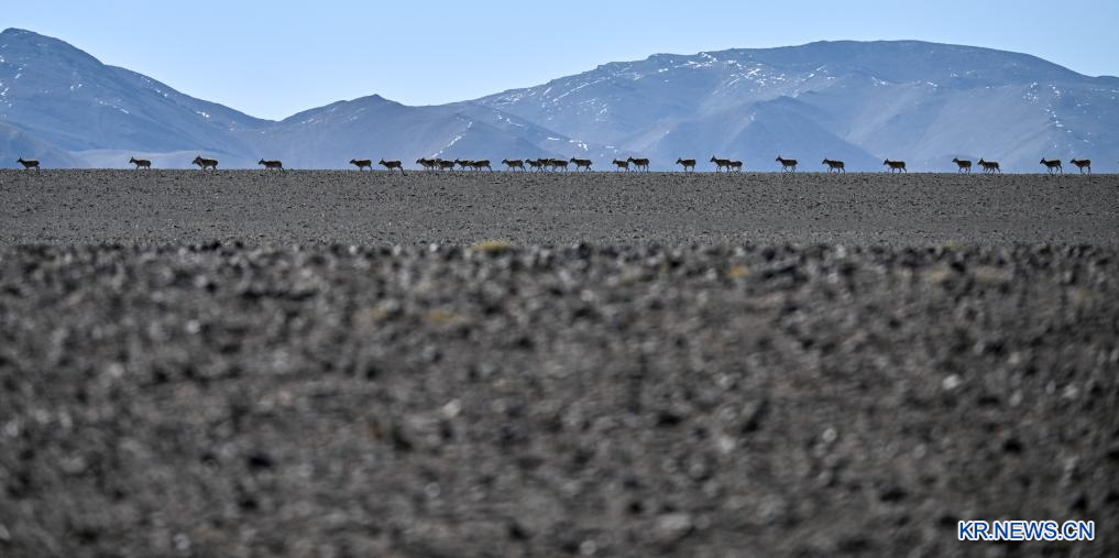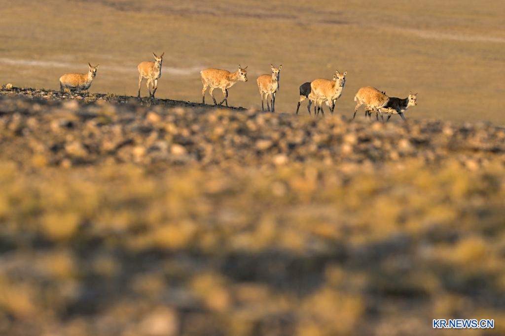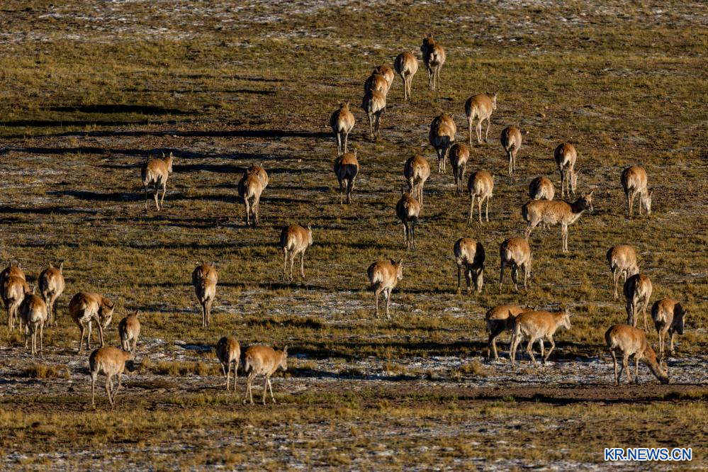 (중국 라싸=신화통신) 10일 짱링양(藏羚羊·시짱 영양) 암컷들이 시짱(西藏)자치구 창탕(羌塘) 국가급자연보호구에서 번식을 위해 이동하고 있다.