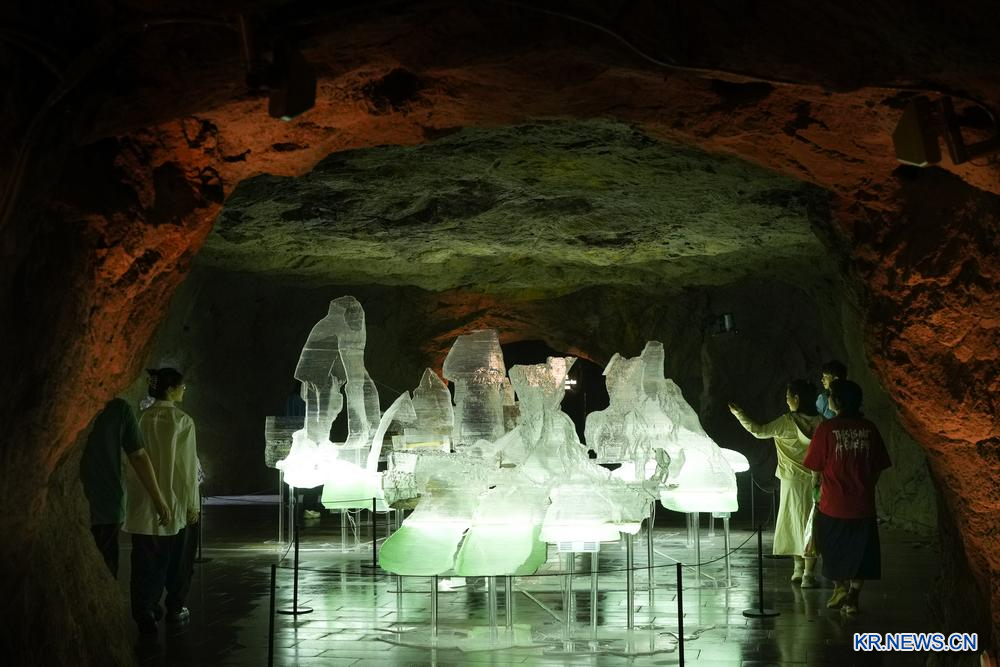[신화망 황옌 6월18일] 황옌(黃岩) 석굴을 찾은 관광객이 17일 설치 예술전을 감상하고 있다.
