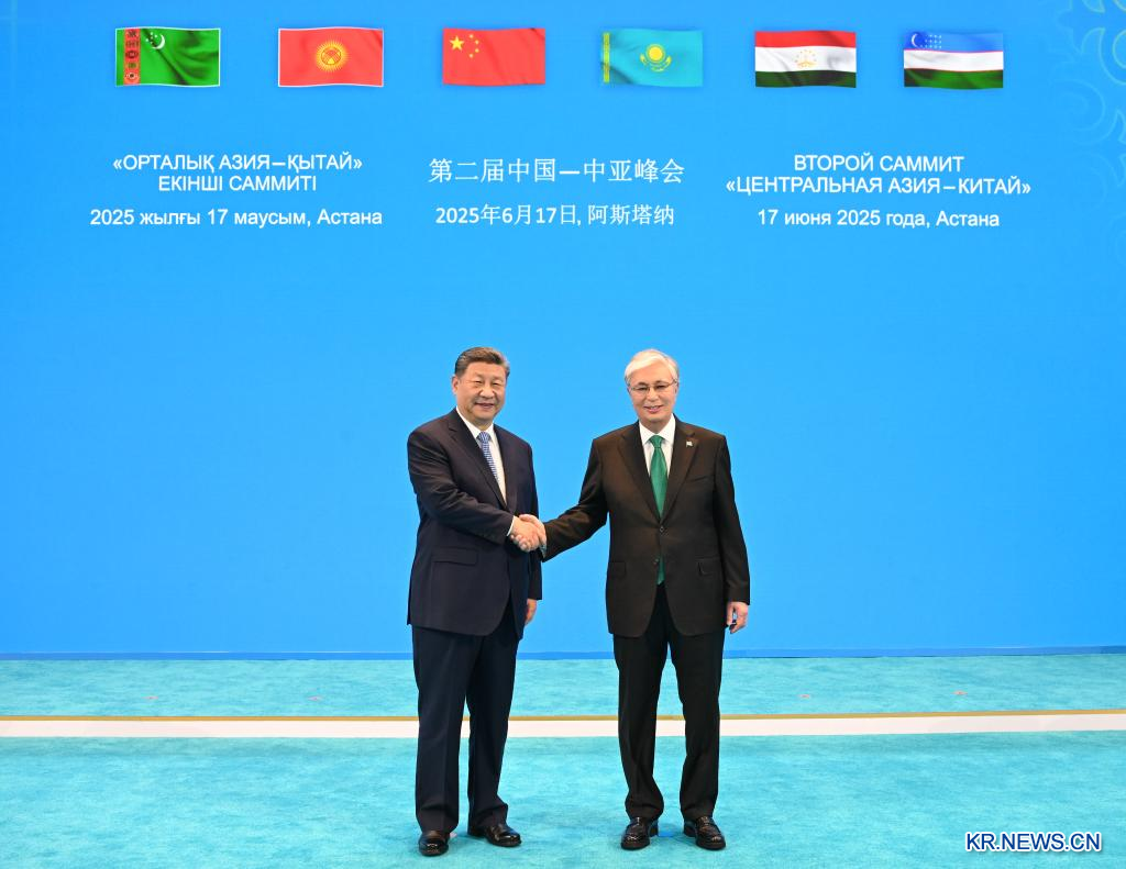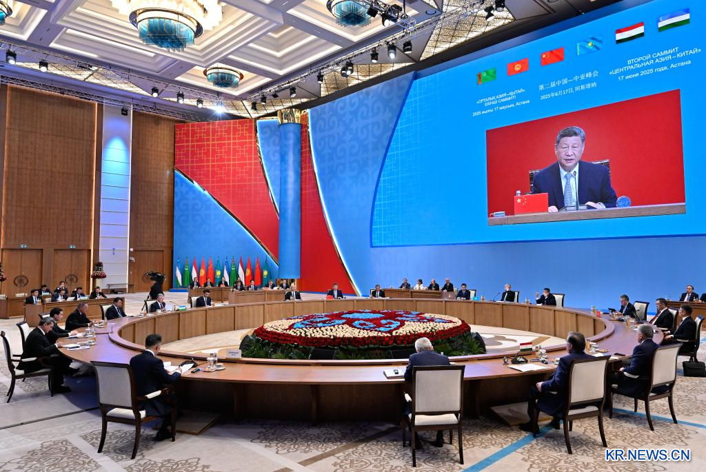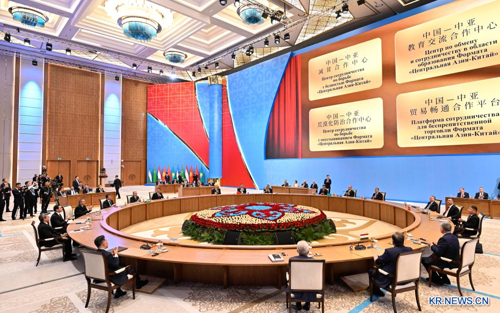 제2회 중국∙중앙아시아 정상회의가 현지 시간 17일 오후 아스타나 독립궁에서 열렸다. 카심-조마르트 토카예프 카자흐스탄 대통령이 회의를 주재했다. 시진핑 중국 국가주석, 사디르 자파로프 키르기스스탄 대통령, 에모말리 라흐몬 타지키스탄 대통령, 세르다르 베르디무함메도프 투르크메니스탄 대통령, 샤브카트 미르지요예프 우즈베키스탄 대통령이 참석했다.[촬영/신화사 기자 인보구(殷博古)]