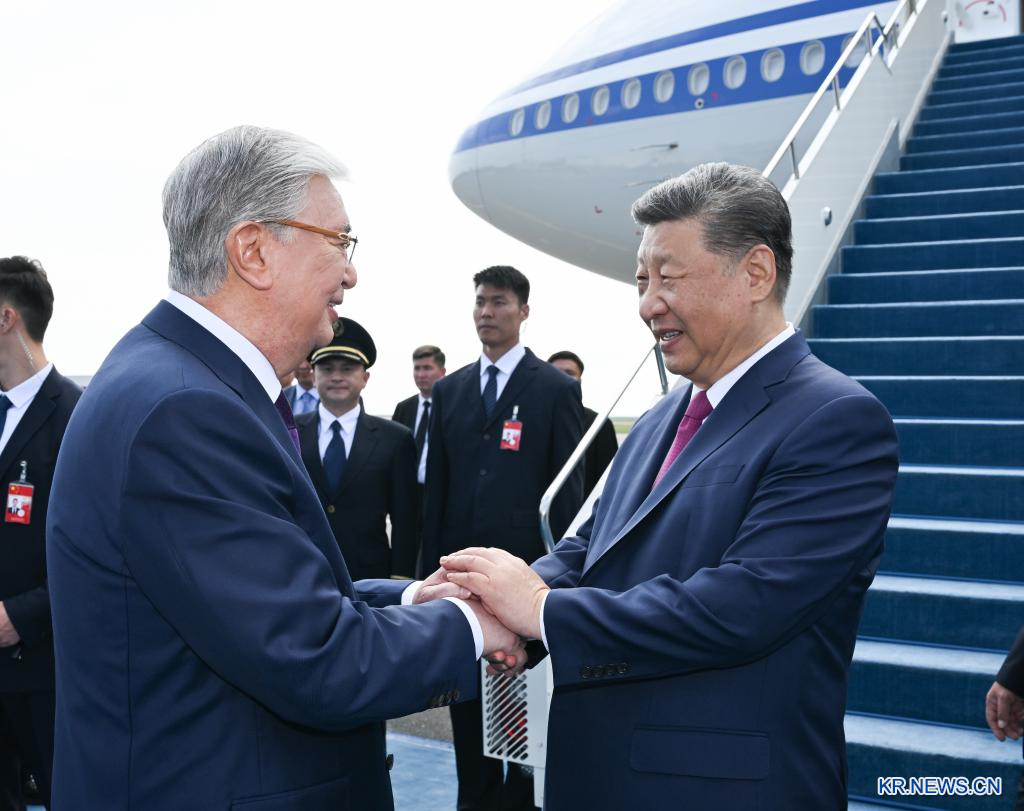현지 시간 18일 오전 시진핑(習近平) 중국 국가주석이 제2회 중국∙중앙아시아 정상회의 참석을 마치고 베이징으로 돌아왔다. 아스타나를 떠날 때 카심 조마르트 토카예프 카자흐스탄 대통령이 고위 관료들을 이끌고 공항에 나와 시 주석을 배웅했다.[촬영/신화사 기자 셰환츠(謝環馳)]