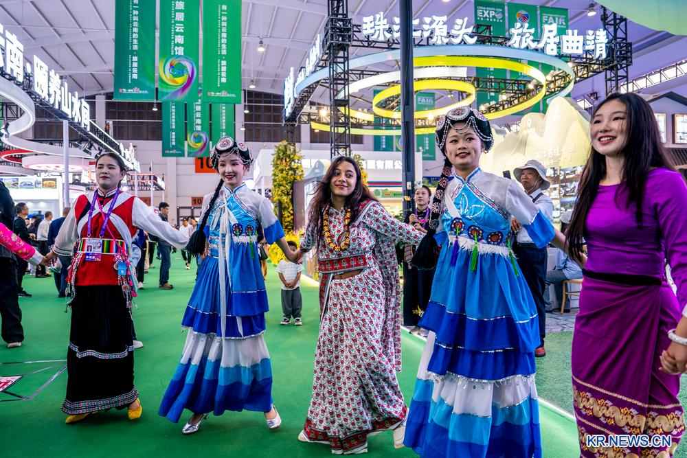 20일 '제9회 중국-남아시아 박람회'에 마련된 '윈난(雲南) 여행·거주 체험관'에서 민족 전통 의상을 입은 직원들이 함께 춤추며 관람객들의 참여를 유도하고 있다.