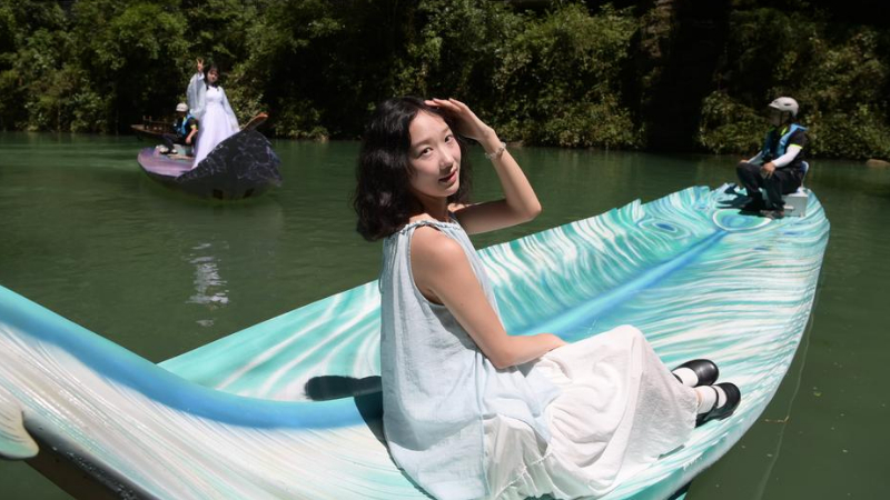 4일 베이다황(北大荒)그룹 헤이룽장(黑龍江) 궁칭(共青)농장회사 논벼과학기술시범원에서 학생들이 논 그림을 배경으로 기념 사진을 찍고 있다.