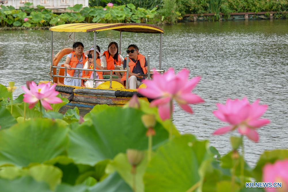 9일 윈난(雲南)성 쿤밍(昆明)시 다관(大觀)공원에서 작은 배를 탄 관광객들이 연꽃을 감상하고 있다.