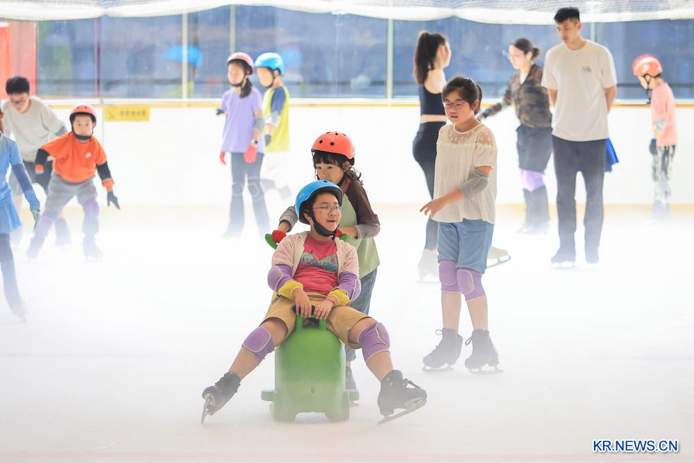 [신화망 베이징 7월15일] 13일 장쑤(江蘇)성 난징(南京)의 한 실내스케이트장에서 시원한 스케이팅을 즐기는 어린이들.