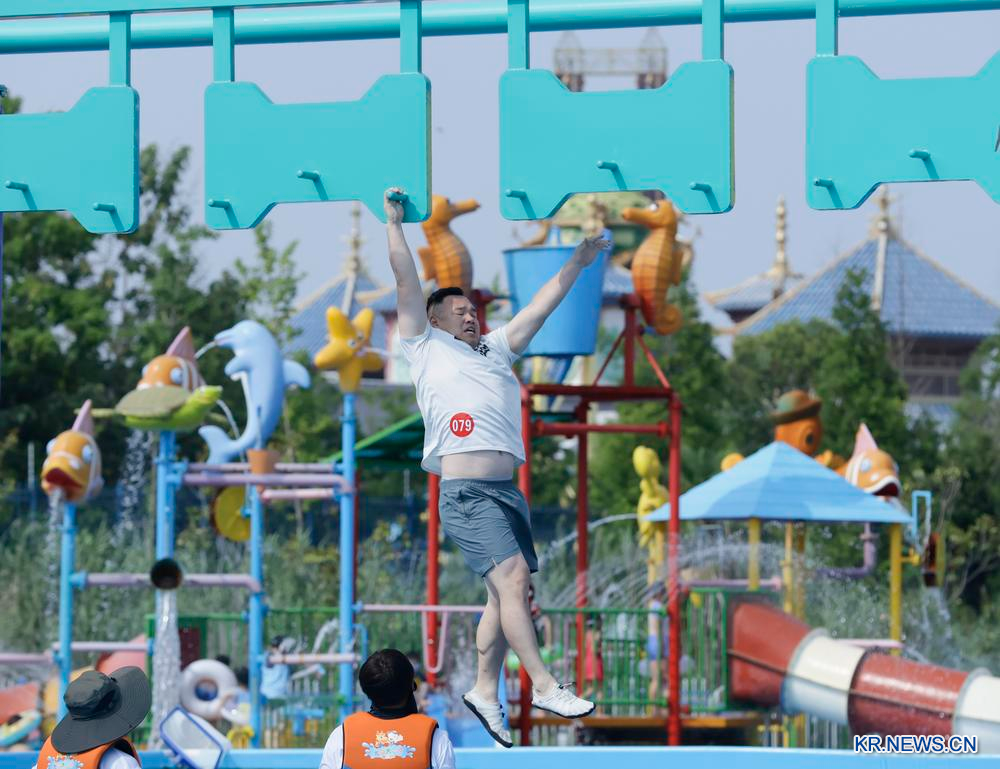 13일 장쑤(江蘇)성 화이안(淮安)에 위치한 물놀이장에서 장애물 통과 게임에 한창인 피서객. 2025.7.14