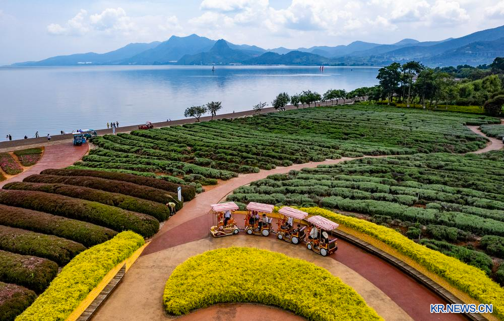 16일 윈난(雲南)성 위시(玉溪)시에 위치한 푸셴후(撫仙湖) 호숫가를 찾은 관광객들.
