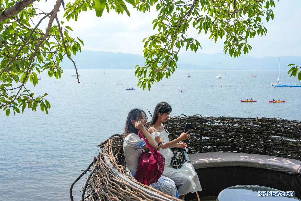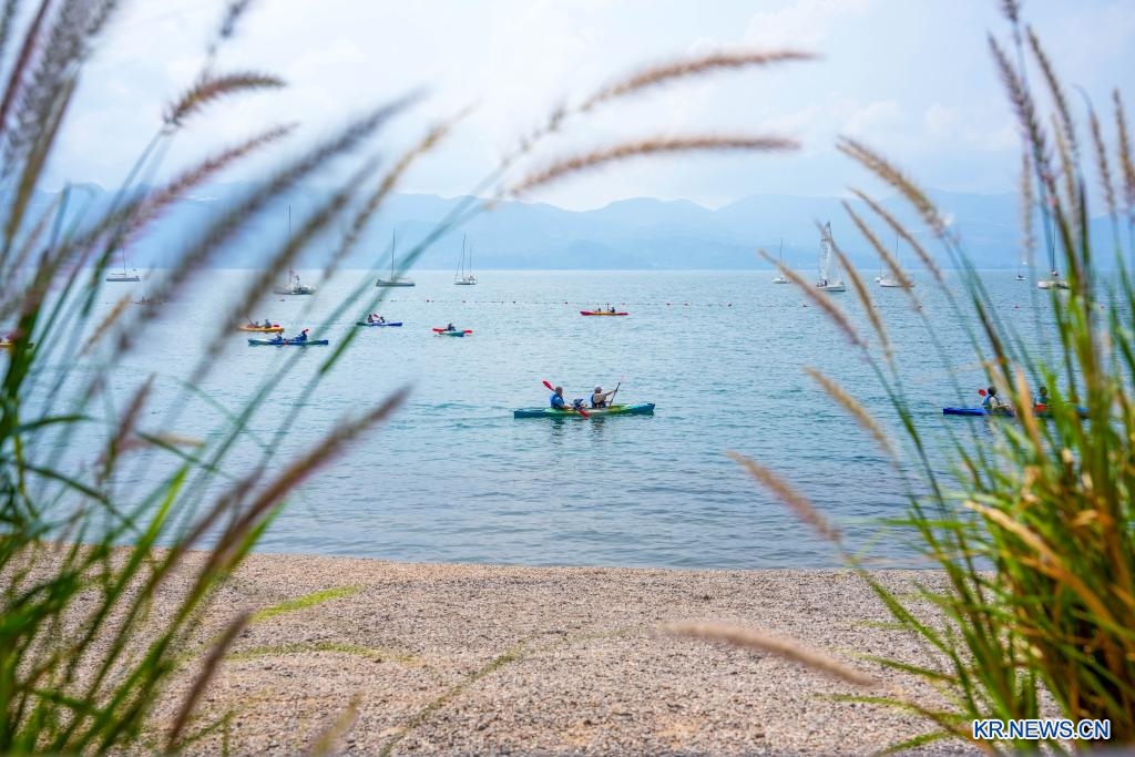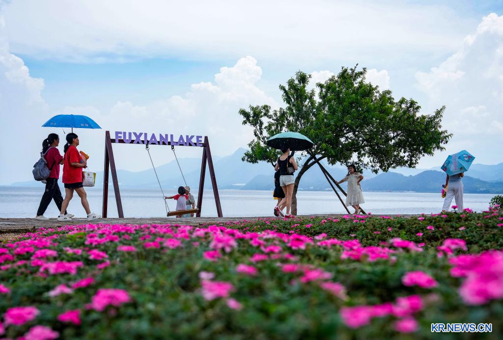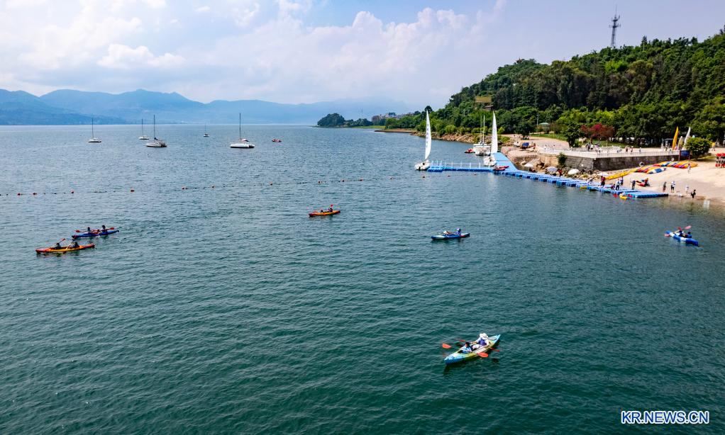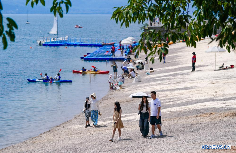 [신화망 위시 7월18일] 여름이 되자 많은 관광객이 윈난(雲南)성 위시(玉溪)시에 위치한 푸셴후(撫仙湖)에서 피서를 즐기고 있다.