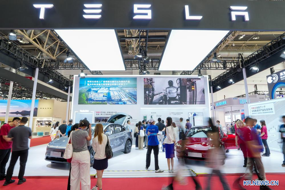 이날 스마트 자동차 사슬 전시구역을 찾은 관람객들이 테슬라 전시부스를 둘러보고 있다. 2025.7.19